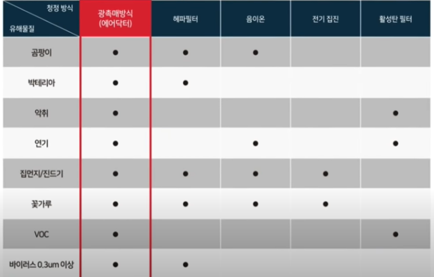 마지막으로 광촉매 방식. 광촉매란 촉매의 일종으로 촉매작용이 빛에너지를 받아 일어나는 물질, 즉, 빛을 에너지원으로 촉매반응(산화, 환원반응)을 촉진시키는 작용이나 반응을 의미한다. 이산화티타늄(TiO2)이 코팅된 20만개의 나노 광촉매 구슬에 자외선(UV)을 비추면 오염된 공기가 산화 반응하여, 크고 작은 2만여 종의 불순물과 유해입자 구조를 0.0001µ(미크론) 입자까지 파괴하여, 수증기와 이산화탄소로 배출한다.
