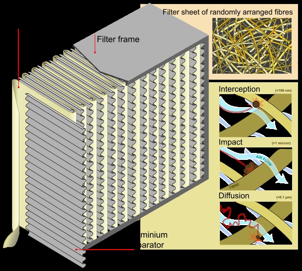 해파필터는 불규칙한 섬유 조직인데, 1차적으로 이 섬유 조직과의 충돌을 통해 오염 물질을 걸러내고, 그와 동시에 중력에 의한 입자침강, 입자의 브라운 운동, 정전기력에 의한 흡착 등을 이용하여 입자를 모아 버린다.